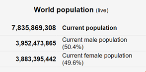 When I looked at the https://countrymeters.info/ , the number of male in this world is only slightly higher than the number of female